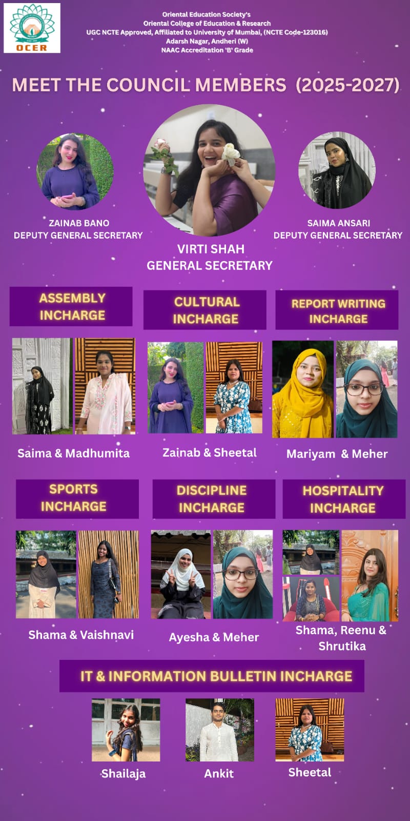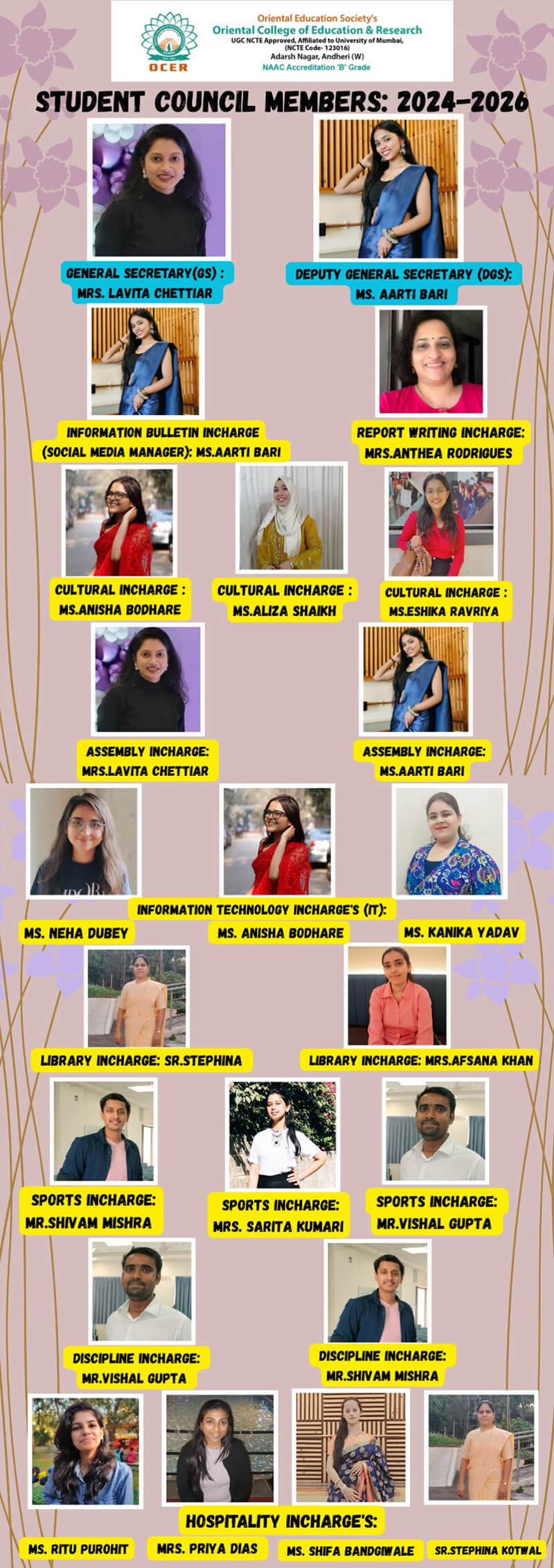 Cultural & Hospitality In charge – Priya Vadav, Jyoti Maurya, Riya Parekh & Dipika Vishwakarma.